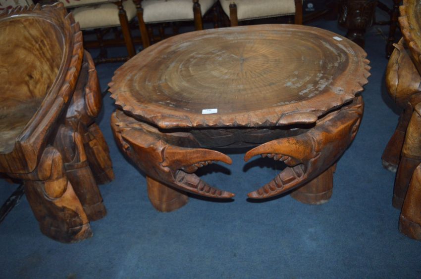 Carved Teak Tree Trunk Set of Garden Furniture in the Form of Crabs; Three Chairs and a Table