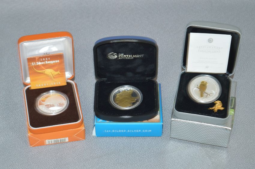 Australian Mint Coins - 2004 Kookaburra, 2004 $1 Silver Kangaroo and 2008 Koala Gilded Coin
