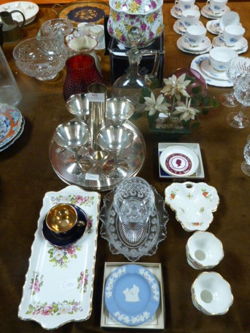 Silver Plate and Glassware Including Decanters, Dressing Table Trays, Jadite Ornament, etc.