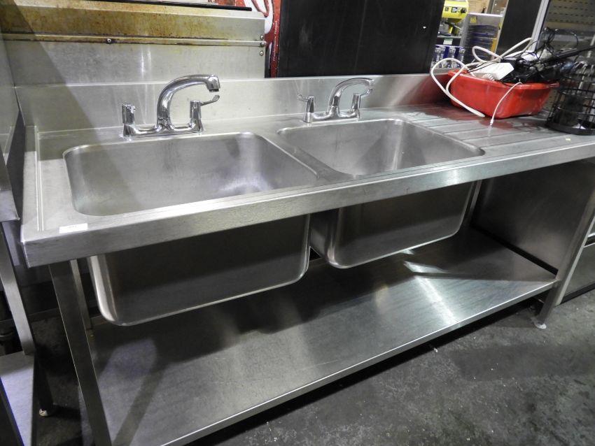 *Stainless Steel Commercial Double Sink with Lever Taps, Right Hand Drainer and Shelf