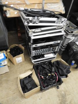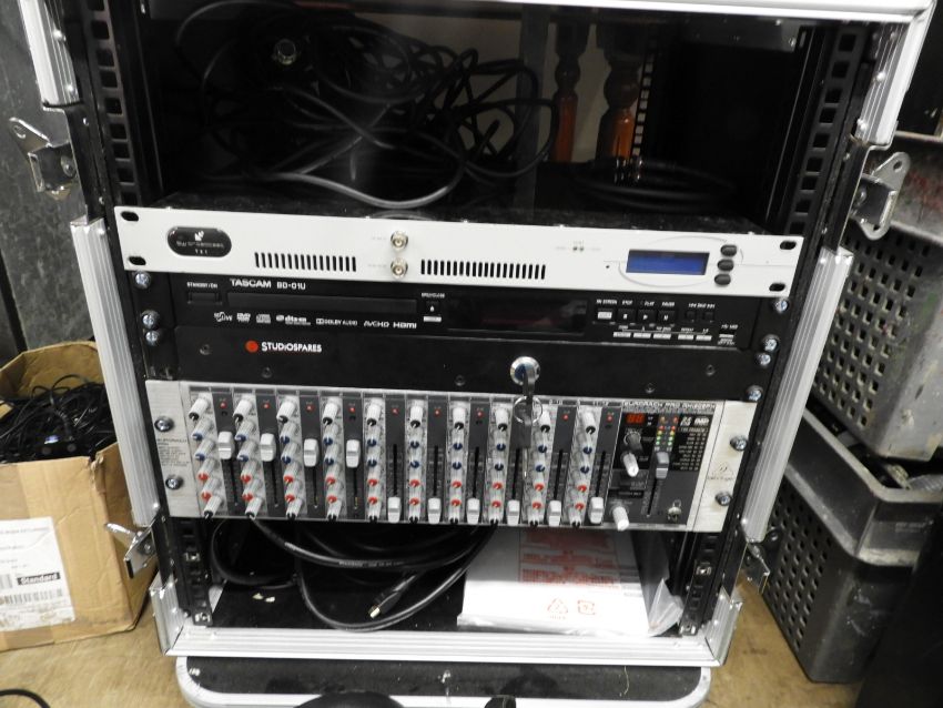 Audio Systems in Rack Comprising of; BW Broadcast TX1 Transmitter with Aerial, Tascam BD-01U Blue Ray Player, Studiospares Unit and a Eurorack Pro RX1202FX 12 Input Line & Mic Mixer Complete with Anker Bluetooth Audio System and Two Way Radios.