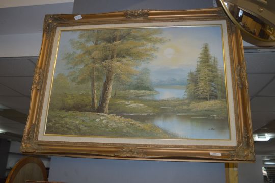 Gilt Framed Oil on Canvas - Lakeside Woodland Scene