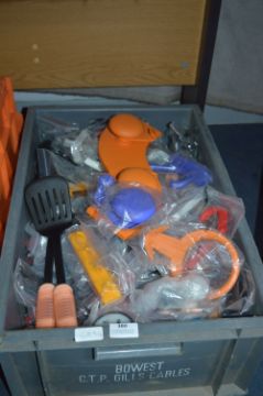 Plastic Crate of New Kitchen Utensils, etc.