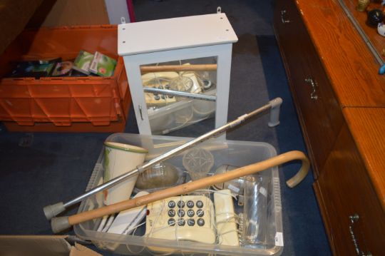 Plastic Box Containing Telephone, Cut Glassware, White Kitchen Cabinet and Walking Sticks