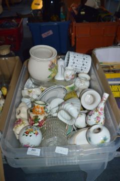 Box Containing Assorted Potpourri, Specimen Vases, Royal Doulton Cups & Saucers, Candle Holders, etc.