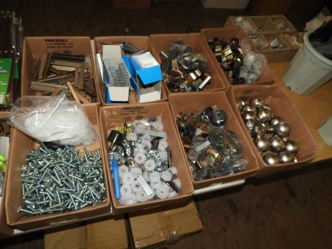 Ten Boxes Containing Assorted Bedknobs, Pneumatic Staples, Ear Plugs, Galvanised Bolts, etc.