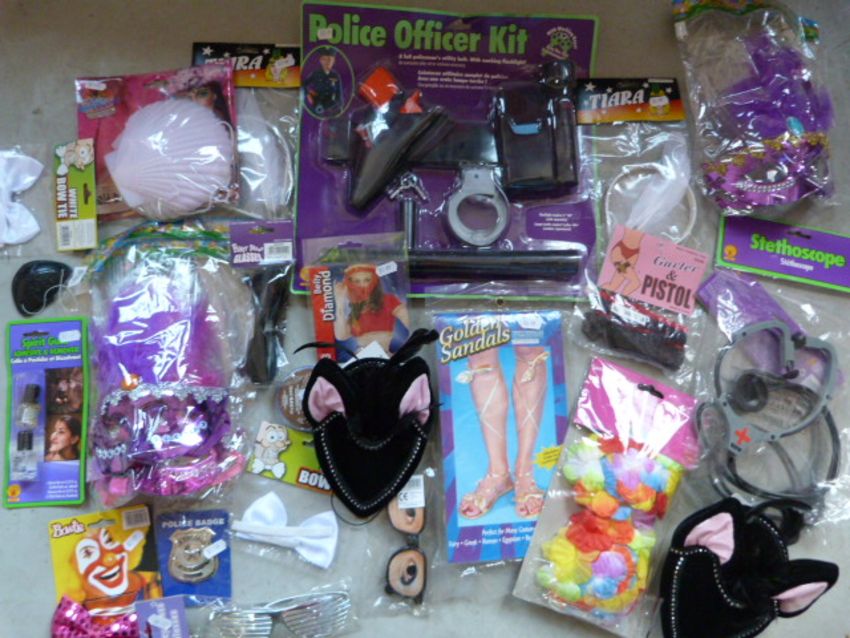 *Bag of Assorted Accessories Including Police Officer Kit, Masks, Shell Bra, etc.