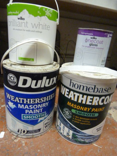 Two Tins of Masonry Paint, Tin of White Gloss and a Part Used Tin of White Emulsion