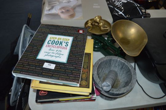 Assorted Kitchen Ware, Cookery Books, Kitchen Scales, Marble Pestle & Mortar, etc.