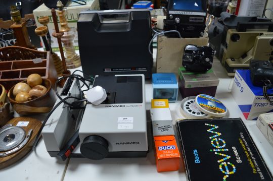 Collection of Cine Projection Gear Including Hanimex Projector, Vintage Elmo Projector, Panorama Editing Machine, etc.
