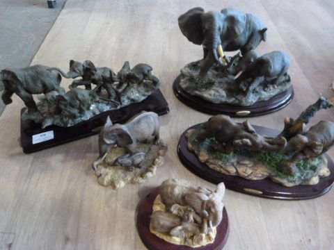Five Resin Elephant Groups on Wooden Bases