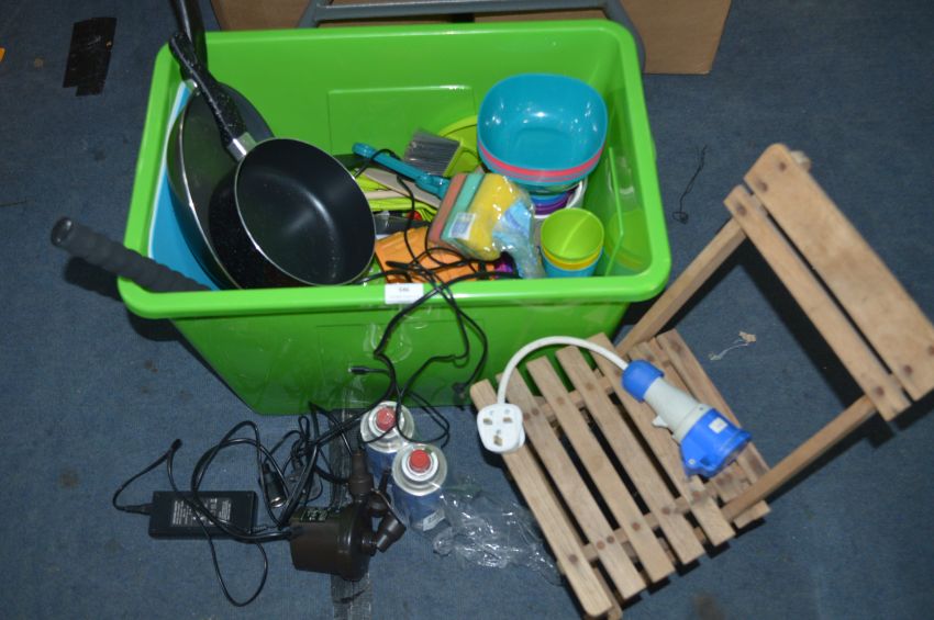 Large Collection of Picnic Ware, Folding Stool, Pans, etc.
