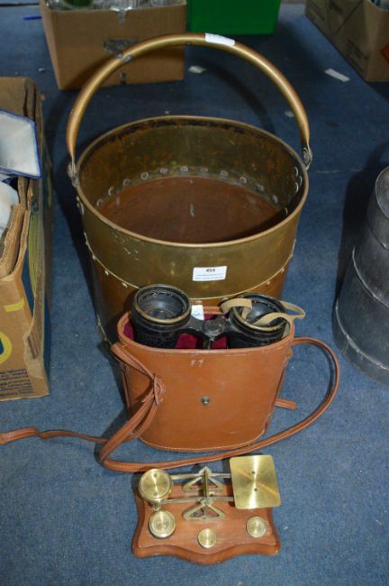 Copper Coal Bucket Containing Binoculars, Scales, etc.