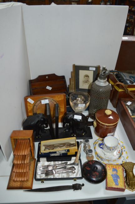 Assorted Collectibles Including Elephant Bookstands, Plated Ware, Cigarette Case, Letter Racks, etc.