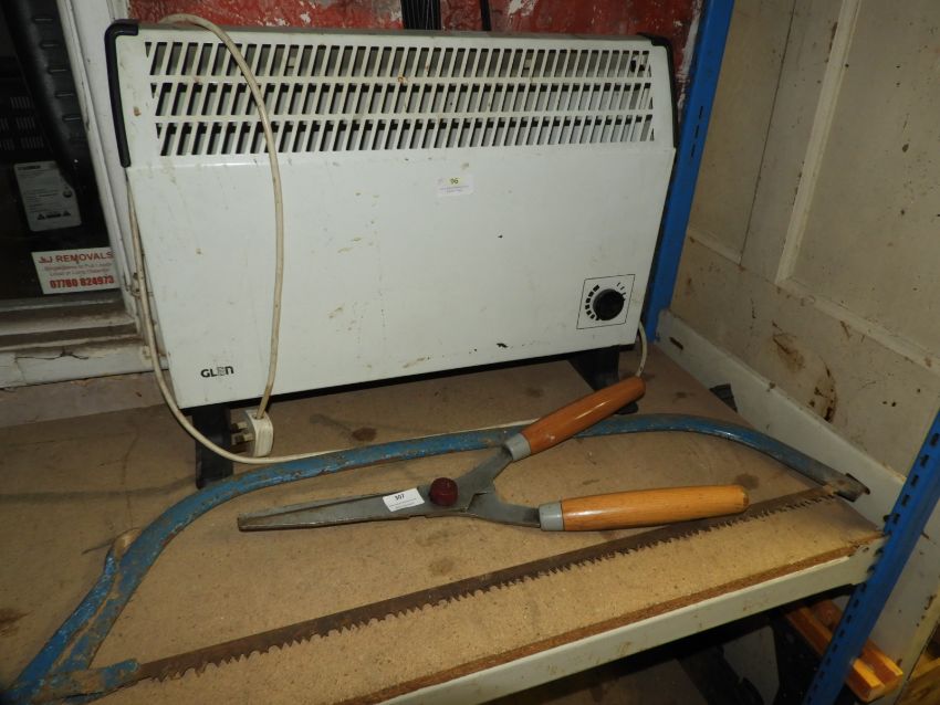 Glenn Electric Heater, Bow Saw and a Spear & Jackson Hedge Trimmer