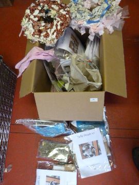Large Box of Wreaths, Lampshade Kits and a Various Crafting Fabrics and Materials