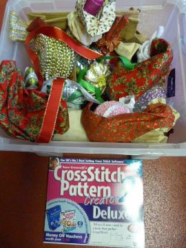 Box Containing Cross Stitch Software, Christmas Decorations and Material