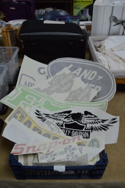 Basket of Motor Decals; Landrover, Michelin, Harley Davidson, etc.