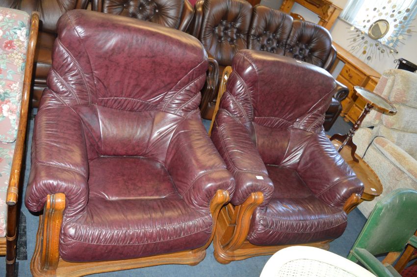Pair of Burgundy Leather Wood Framed Armchairs