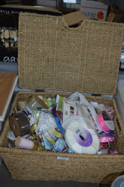 Large Basket Containing Assorted Ribbons, Trim, Lace, etc.