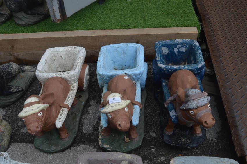 Three Painted Donkey and Cart Garden Ornaments