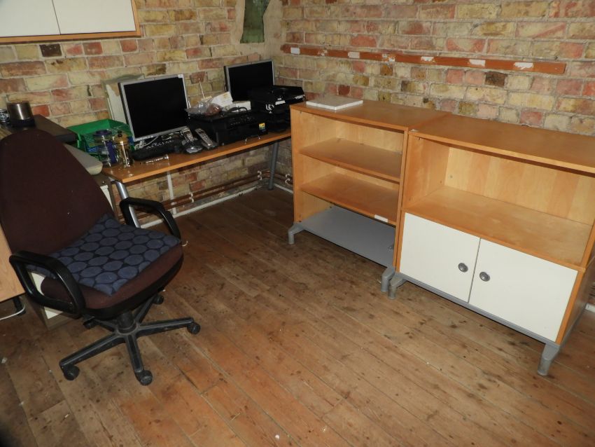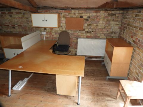 *Range of Office Furniture Comprising of Straight Desk, Two Freestanding Open Fronted Units, Two Wall Mounted Storage Cupboards and a Chair