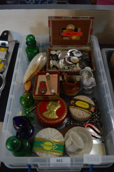 Tray Lot of Collectibles Including Buttons, Bottles, Soaps, Tins, etc.