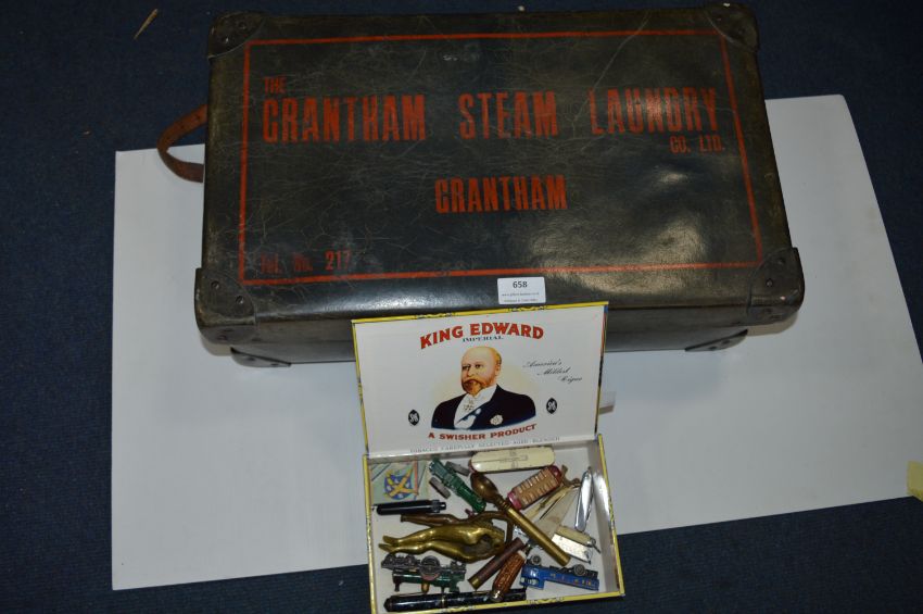 Cigar Box and Contents of Collectibles; Brass Nutcrackers, Bottle Openers, Stamp Pens and Grantham Steam Laundry Case
