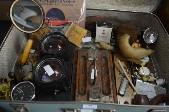 Suitcase Containing Old Collectibles; Ink Stands, PIpes, etc.