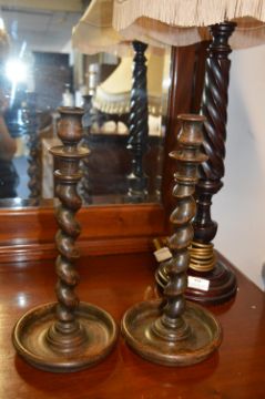 Turned Mahogany Barley Twist Table Lamp and a Pair of Candlesticks