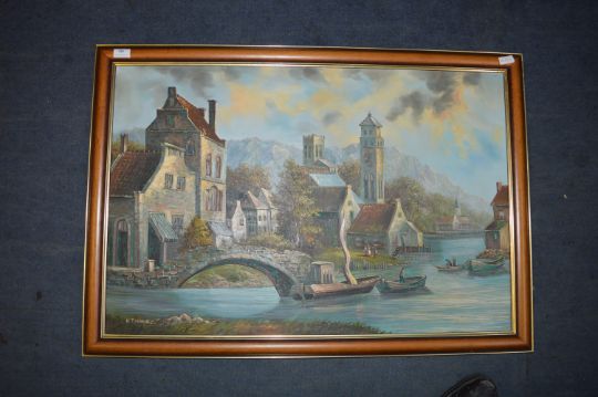Oil on Canvas - Continental River Scene by K. Pelonie