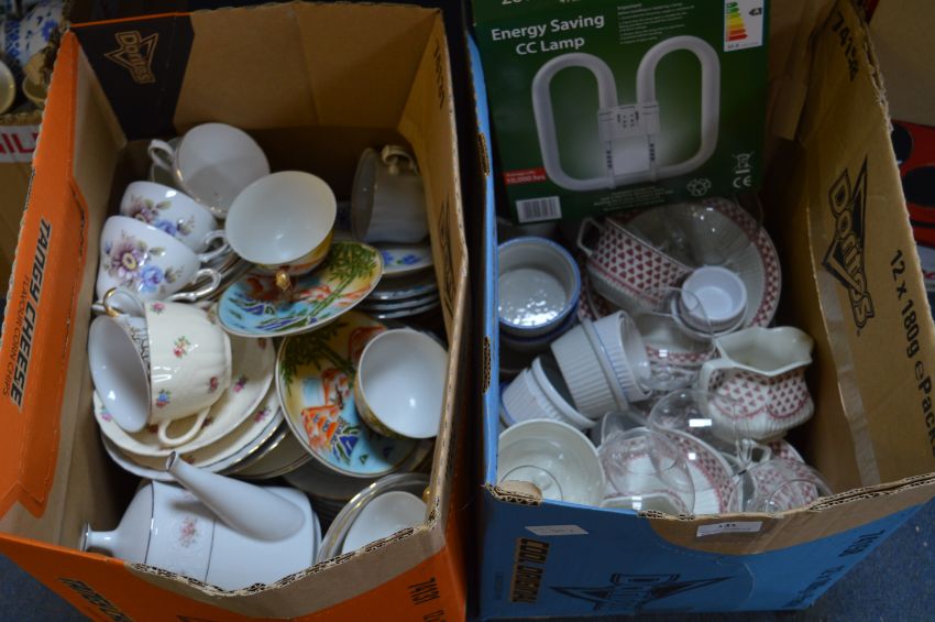 *Two Boxes of Pottery Items Including Cups, Saucers, Dishes, Ramekins, etc.