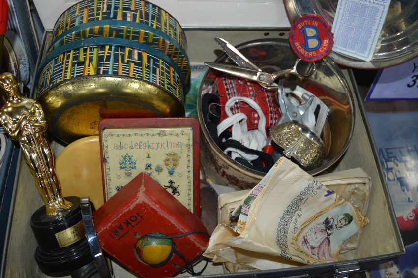 Suitcase Containing Vintage Items Including Cake Tin, Oscar & Old Adverts, Umbrella, etc.