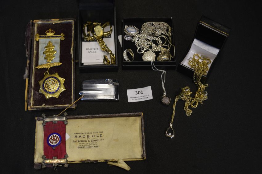 Tray Lot including Two RAOB Medals, 925 Sterling Silver Jewelry, Sekonda Watch, Costume Jewelry etc