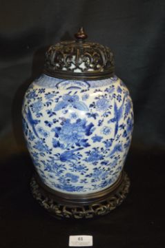 Chinese Blue and White Ginger Jar with Fret Work Wooden Base and Lid