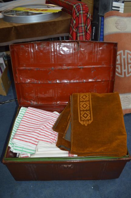 Tin Trunk Containing Vintage Tea Towels, Towels, Covers etc