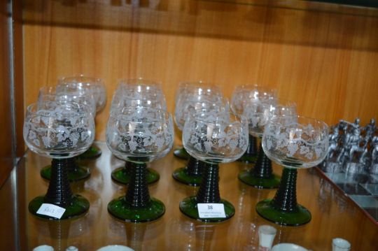 Set of Twelve Etched Green Glass Wine Goblets