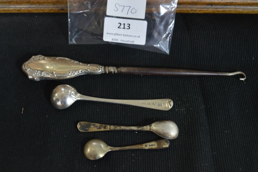 Sterling Silver Button Hook and Three Mustard Spoons