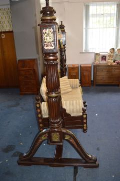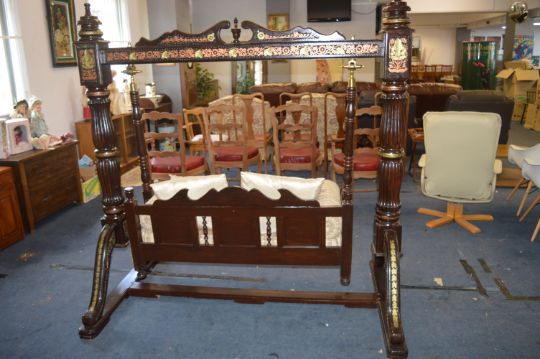 Ornately Carved Indonesian Love Swing in Teak with Copper & Gilt Decoration, Upholstered Seat and Cushions (Length 180cm, Height 180cm)