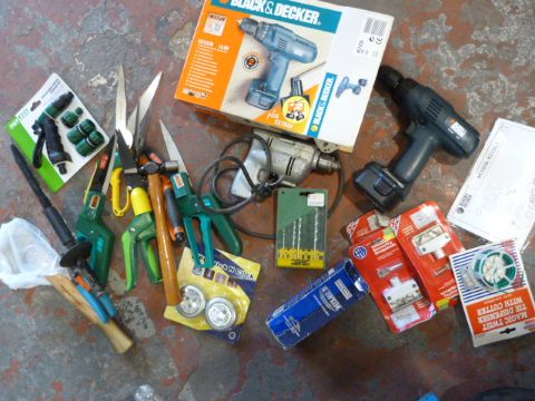 Box of Assorted Garden Tools and a Black & Decker Drill