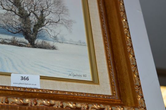 Gilt Framed Oil on Canvas by Neil Spilman - Single Tree in a Snowy Field 1985