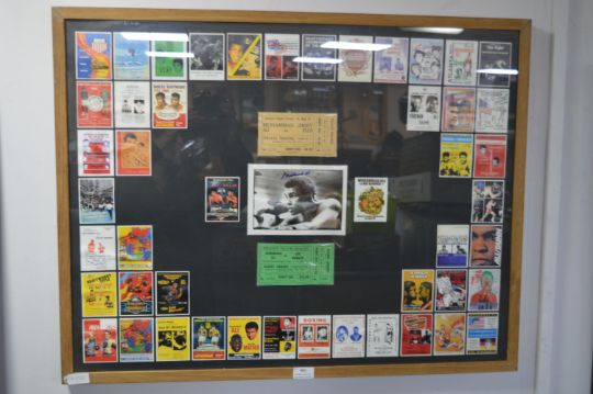 Framed Muhammad Ali Signed Photograph in between Two Fight Admission Tickets with Promotion Details of 48 of his Fights