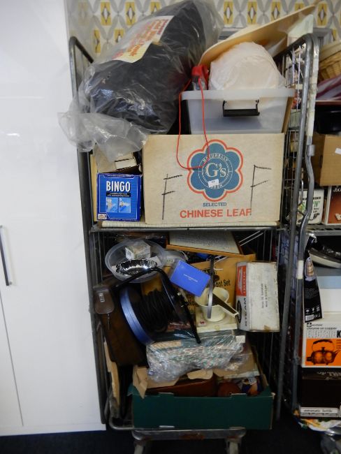 Cage of Assorted Household Goods, Steam Iron, Kitchenware, Suitcase, etc.