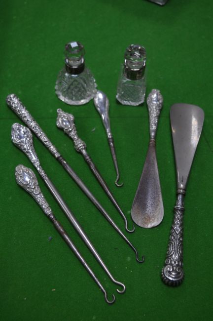 Silver Handled Button Hooks, Shoe Last and Scent Bottles