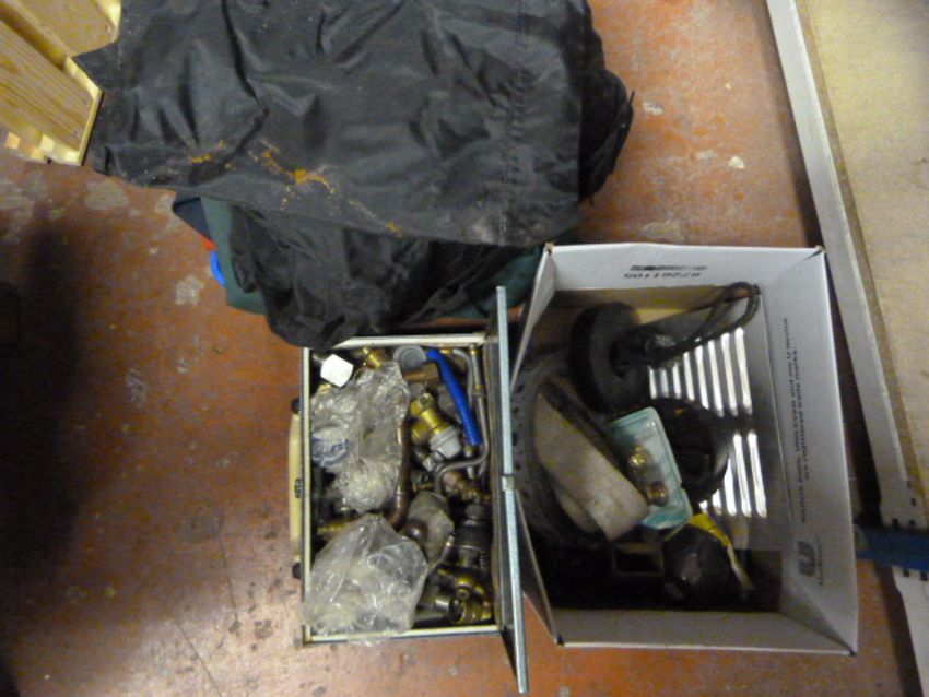 Box of Overhauls and Waterproofs, Plumbing and Assorted Fittings