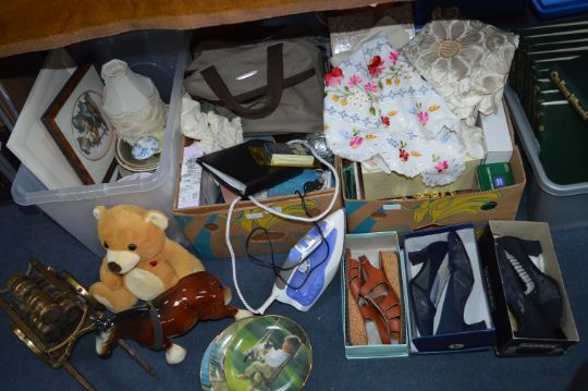 Three Boxes of Household Goods Including Electric Irons, Teddy Bears, Shoes, etc.