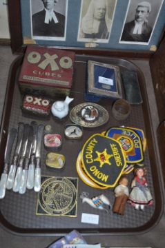 Tray of Collectibles, Tins, Silver Framed Mirror, etc.