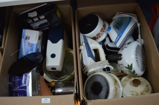 Two Boxes of Household Goods Including Pans, Kettles, Irons, etc.