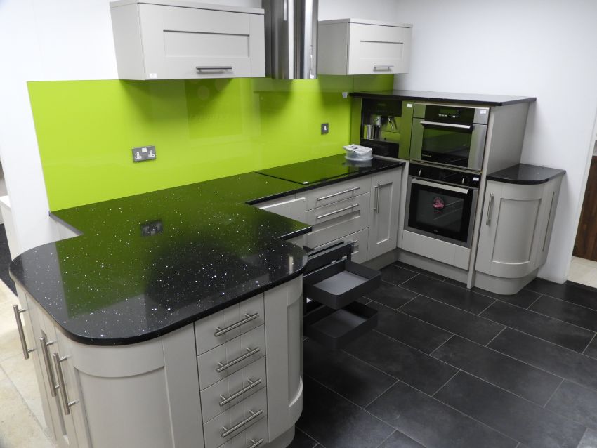 *Mileden Stone Display Kitchen with Five Piece Vinyl Wrapped Doors, Brushed Stainless STeel T-Bar Handles, Negro Stellar Quartz Worktop. REF: 5