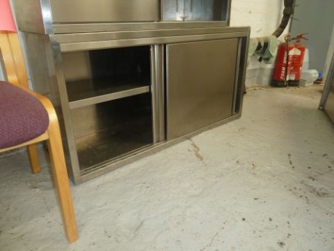 * St Steel wall cabinet, shelving good condition. (600H x 1500W x 400D)